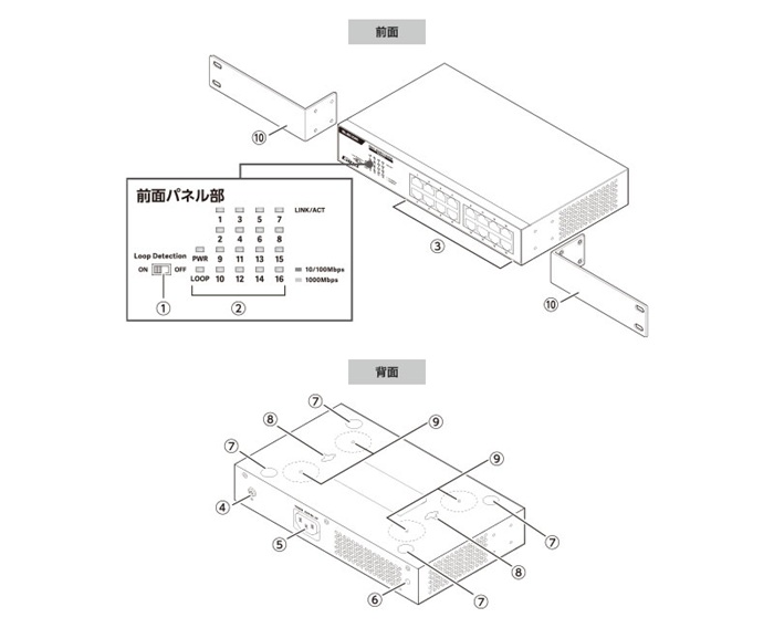 | ① ループ検知スイッチ ② 前面パネルLED ③ LAN ポート ④ FG 端子 ⑤ 電源コネクター ⑥ ACケーブル抜け防止バンド取付穴 ⑦ ゴム足取付部 ⑧ 壁掛け穴(間隔120mm) ⑨ マグネット取付部 ⑩ 19インチラック取付金具 |