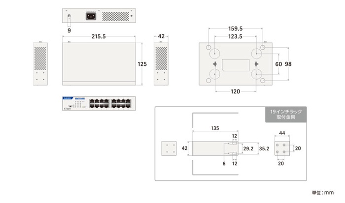 付属のパーツを使用することにより、19インチラック(EIA規格)へ簡単に組み込むことができます。また、正面に大きくLEDランプを表示することで、点灯状態を見やすくしています。