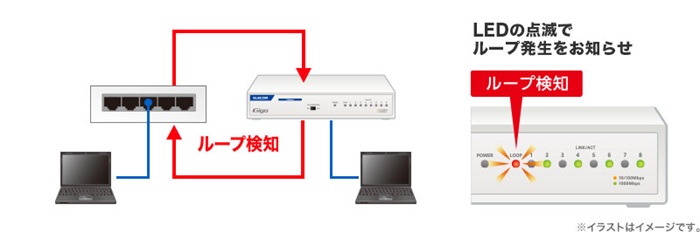 ループ検知機能を搭載しています。LEDランプの点滅によりネットワークループ発生をお知らせし、ネットワーク障害の解消を促します。