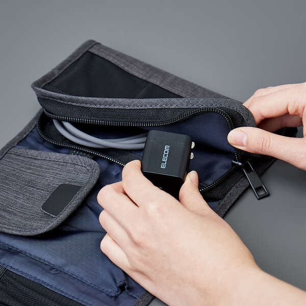 未使用時はコンセントプラグを折りたたんで充電器本体に収納可能です。スッキリとコンパクトに収納できるので、持ち運びにも便利です。