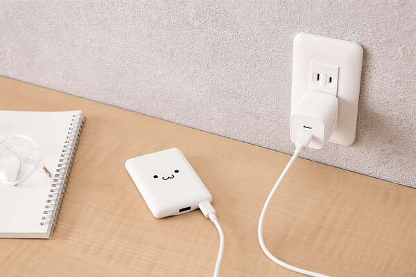 付属のケーブルを本製品の充電用USB Type-Cポートに接続し、対応したACアダプターに接続することで充電可能です。