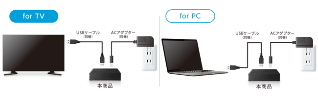 テレビ・パソコンとの接続は、付属のUSBケーブルでつなぐだけ。あとはACアダプターをコンセントに挿せば設置完了です。