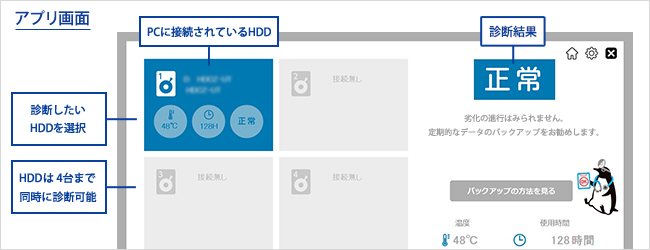 本アプリはHDDの使用状態をチェックできるWindows専用アプリです。HDDの状態を定期的に確認することで、お客様ご自身で買い替え時期の目安を知ることができます。