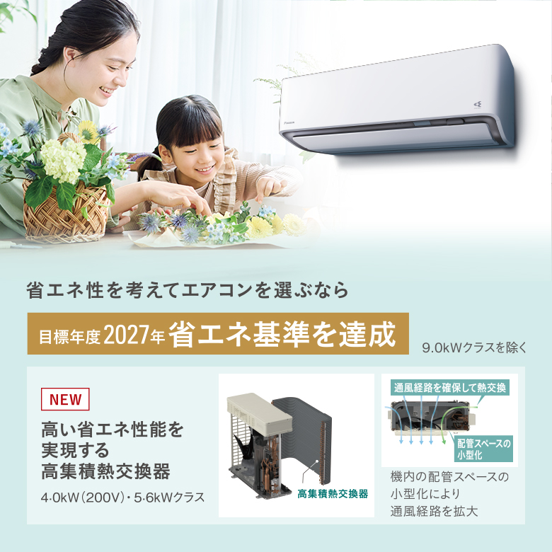 リビングや寝室、仕事部屋など、長時間エアコンを使用するなら省エネ性の高さがポイント。目標年度2027 年省エネ基準達成モデルなら、高い省エネ性を発揮します。