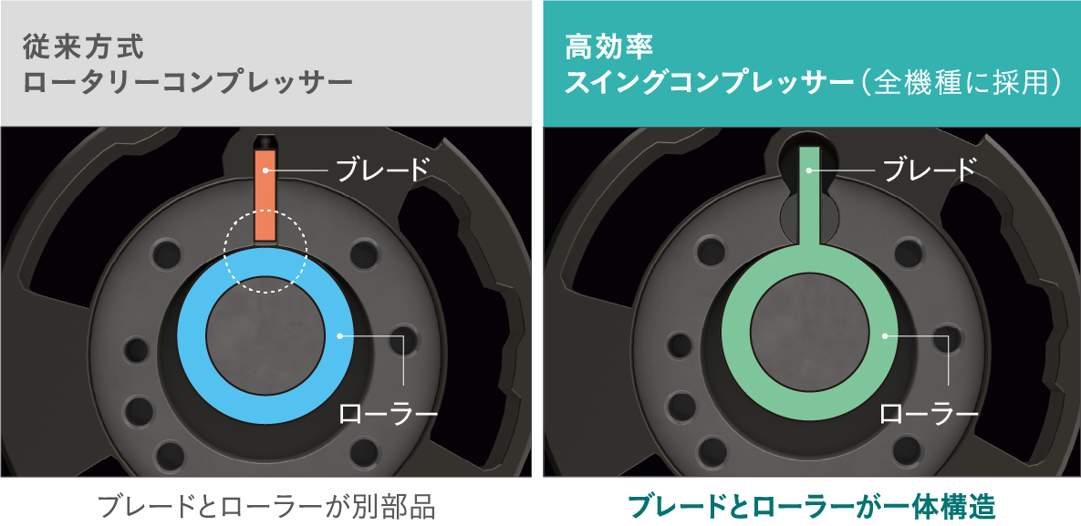 ダイキン独自の技術による、ブレードとローラーが一体になった構造を採用。摩耗や振動を抑え、冷媒圧縮時のロスが少ない高効率なコンプレッサーです。