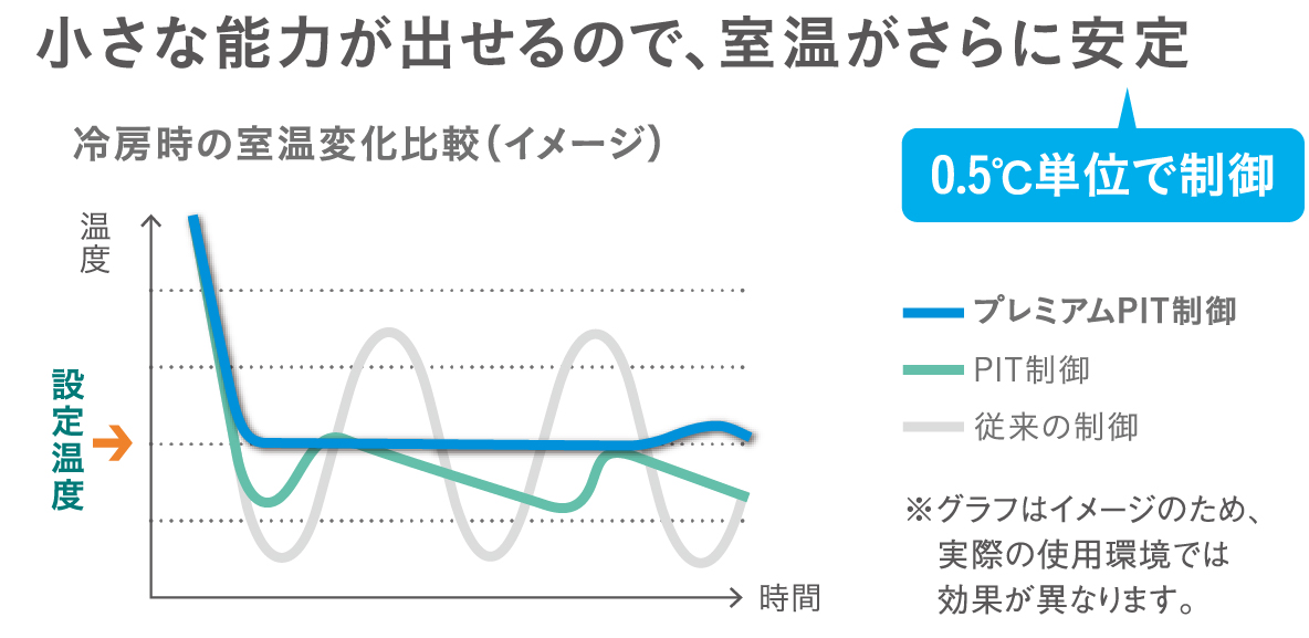 室外機に搭載した「スイングコンプレッサー」「電子膨張弁」の働きにより、小さな能力での運転を可能にしました。室温の変動が少なくてムダのない室温制御を行うことができます。