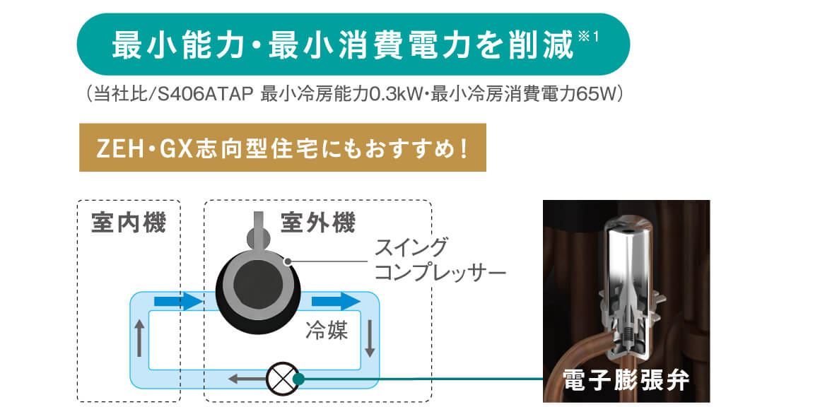 ※1. 新機種2026年S406ATAPと従来機種2025年S405ATAPとの比較。【最小冷房能力】新機種:0.3kW、従来機種:0.5kW 【最小冷房消費電力】新機種:65W、従来機種:85W