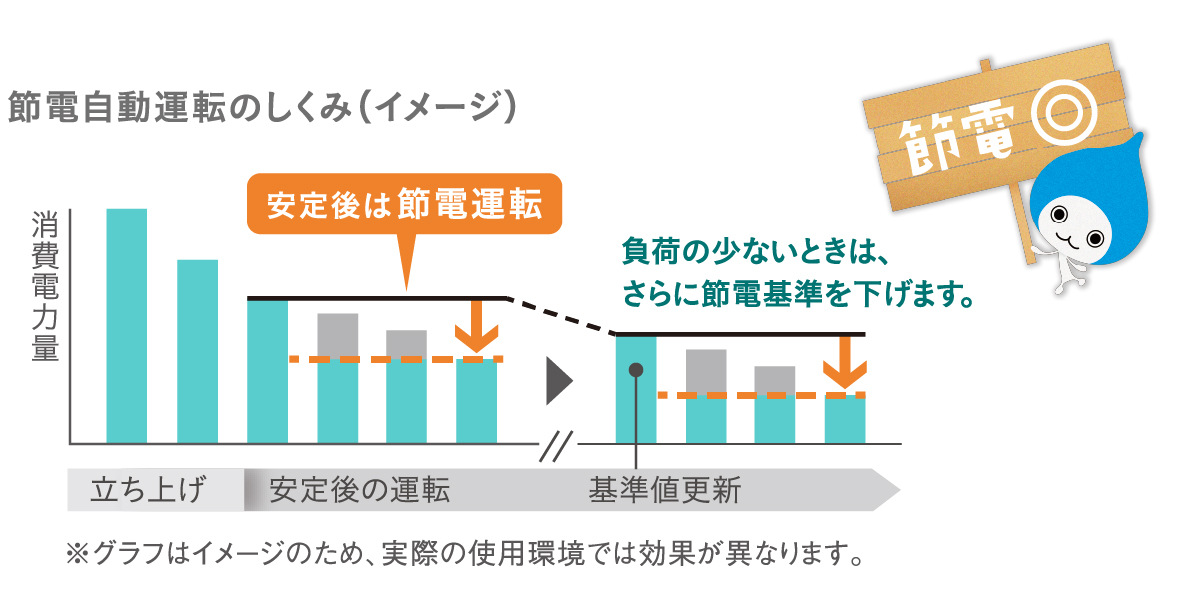 • 実際の消費電力量は条件により異なります。電力の使用量を控える運転です。能力を必要としない運転時には節電中でも電力消費が変わらない場合があります。