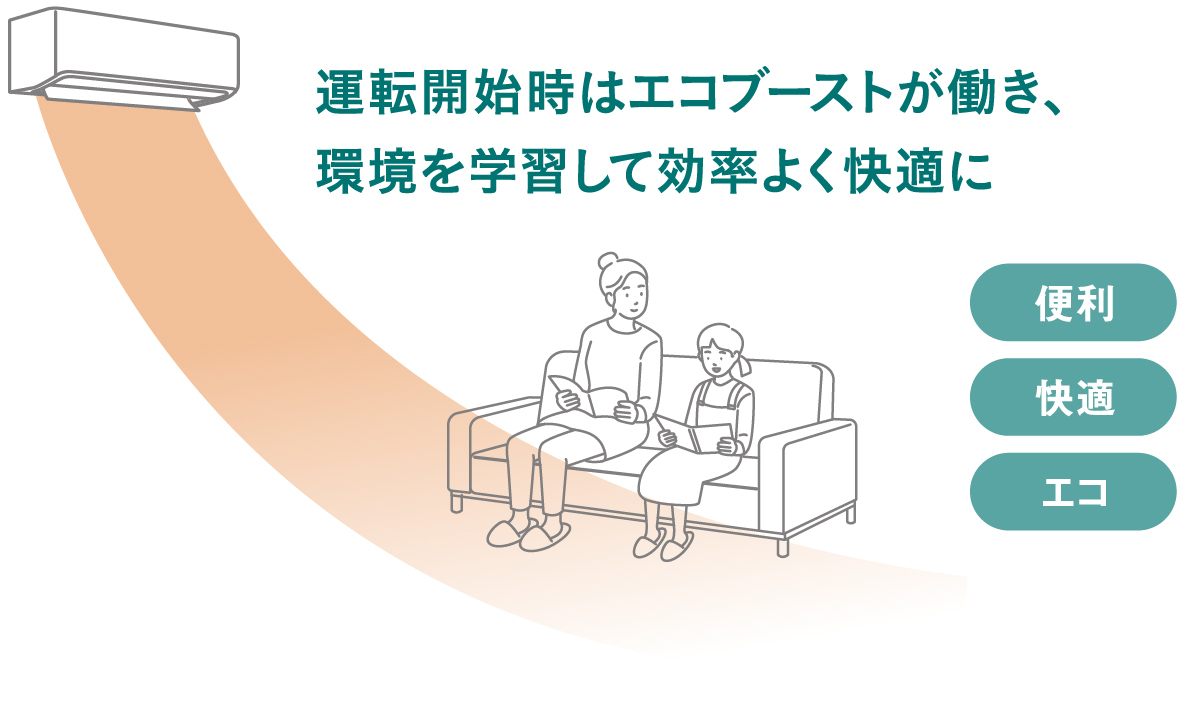 運転はじめはしっかりと空調を行い、室内が設定温度・しつどに到達し安定すると、電力を抑えて運転。温度に加えしつどもコントロールするので、その時々の空調の必要能力に合わせてかしこく、無理をしすぎない節電運転を行います。