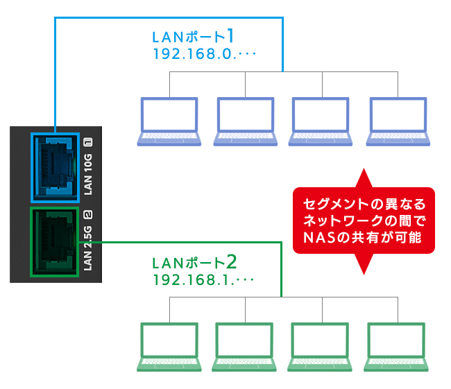 セグメントの異なるネットワークの間で10GbEと2.5GbEでの高速共有が可能です。