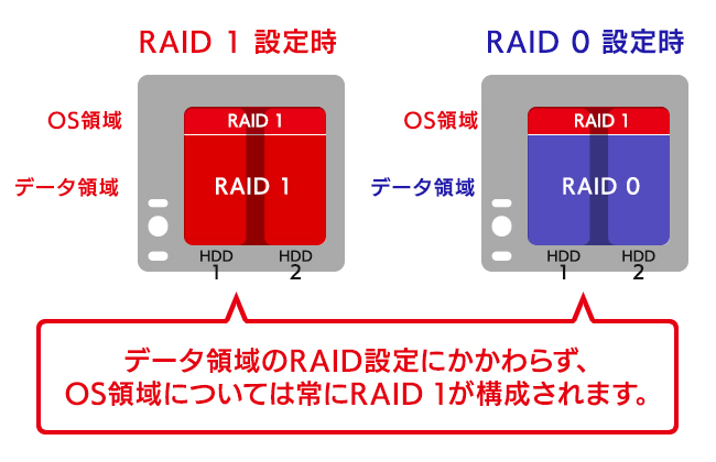 万が一の事態にもシステムの安全な運用が可能なよう、ドライブのOS領域とデータ保存領域が別々のパーティションに分かれています。また、OS領域についてはデータ領域のRAID設定にかかわらずRAID 1が設定され、冗長性が確保されています。