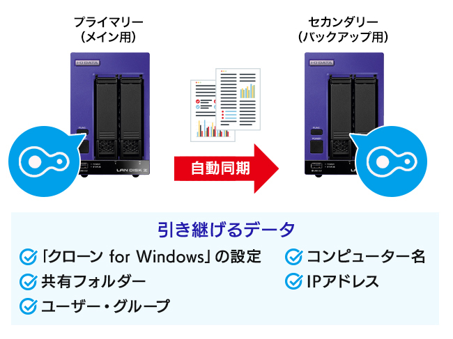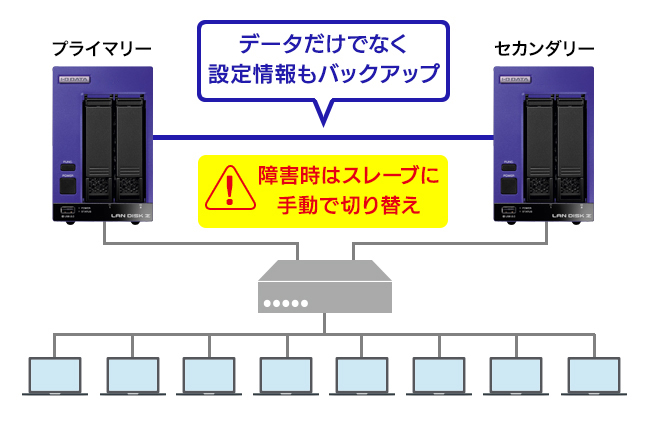 リレーNASとは本商品を2台(プライマリー/セカンダリー)用意し、マスターが故障した場合はスレーブを昇格させることで、ダウンタイムを最小限に抑えるバックアップ構成です。データはもちろん設定情報も同期するため、ユーザーに与える影響だけでなく、復旧にかかわる工数も大幅に減らすことが可能です。