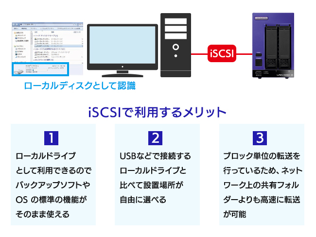 iSCSIターゲット機能により、本商品上に作成した仮想ディスク(VHDX)をiSCSIストレージとして提供することができます。