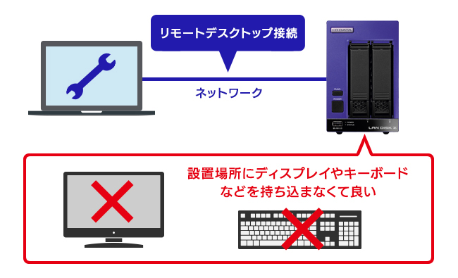 本体を直接操作することなく、ネットワークを経由して遠隔操作を行うことが可能です(リモートデスクトップ接続)。設置場所に液晶ディスプレイやキーボードなどの入力機器を設置する必要がなく、管理者が自席から対象機を操作することができるので便利です。