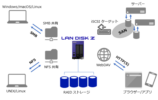 本商品は、Windowsネットワークの標準のファイル共有プロトコル「SMB」のほか、「iSCSI」、「NFS」「WebDAV」の3つのプロトコルに対応し、異なるデバイスからの多様な利用シナリオに柔軟に対応できます。「NICチーミング」機能を利用すれば、本商品の複数のLANポートを束ね、トラフィックの負荷分散や冗長化を実現できます。
