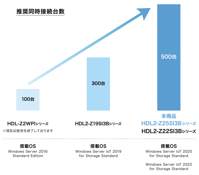 搭載CPU性能の向上により、推奨最大同時接続数が500台に大幅にアップ。これまで難しかった全社用のNASとしてもご利用いただけるようになりました。