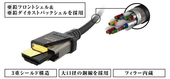 8K(60P)/4K(120P)に対応し、超高解像度かつ更になめらかな映像の伝送が可能なUltra High Speed HDMI® Cable規格認証済ケーブルです。