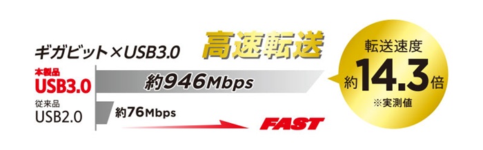 ギガ有線LANアダプターを使ったギガビット通信とパソコン接続部USB3.0の組み合わせにより、USB2.0搭載の旧製品(EDC-FUA2H-B)と比べ、ダウンロードしたデータを14.3倍(実測値)の速度で高速転送ができます。