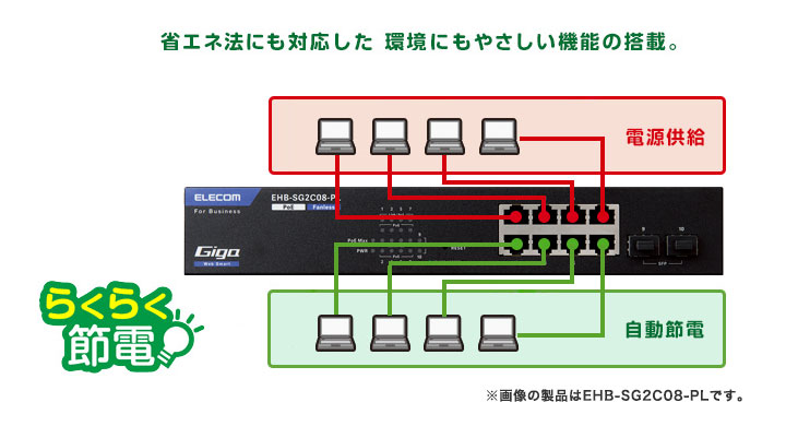 省エネ法に準拠の省電力機能で、自動的に省エネ貢献できるらくらく節電E機能対応。 IEEE 802.3az(EEE規格)に対応しているスイッチや端末との組み合わせで手間なく自動的に省エネを実現します。