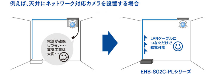 全ポートがIEEE 802.3af/at(PoE+)準拠の給電に対応し、無線アクセスポイントやネットワークカメラなどのPoE受電対応デバイスにLANケーブルを通じてデータとともに電力を供給できます。 新たに電源工事をしなくても、デバイスを稼働させることができます。