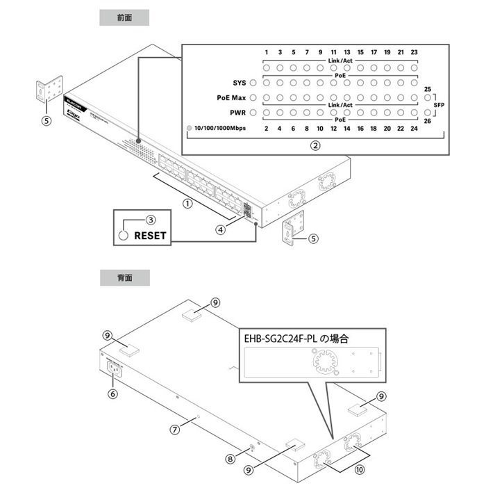 | ① LANポート ② 前面パネルLED ③ RESET ④ SFPポート ⑤ 19インチラック取付金具 ⑥ 電源コネクター ⑦ ACケーブル抜け防止バンド取付穴 ⑧ FG端子 ⑨ ゴム足取付部 ⑩ ファン |