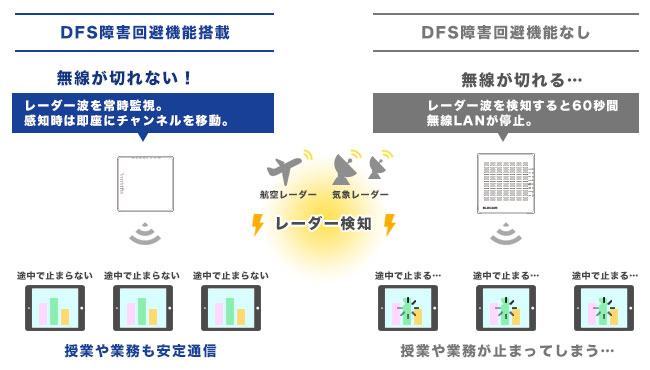 FS障害回避機能搭載で、5GHz DFS帯使用時でも切れない無線環境を構築し、教育現場や工場などで快適・安定通信を保ちます。