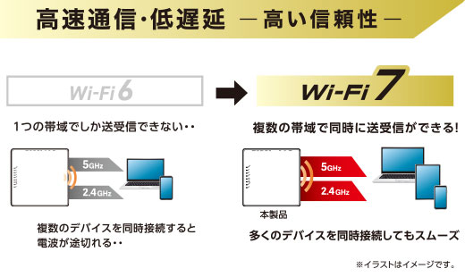 ※MLO、Multi-RU、プリアンブルパンクチャリングなどのWi-Fi 7での通信は、接続機器側も同機能に対応している必要があります。