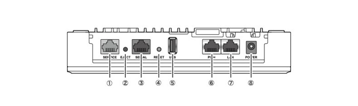 | ① サービスポート ② USB イジェクトボタン ③ シリアルポート ④ リセットボタン ⑤ USB ポート ⑥ PD(IN) ポート (2.5GE) ⑦ LAN ポート (1GE) ⑧ DC ジャック |