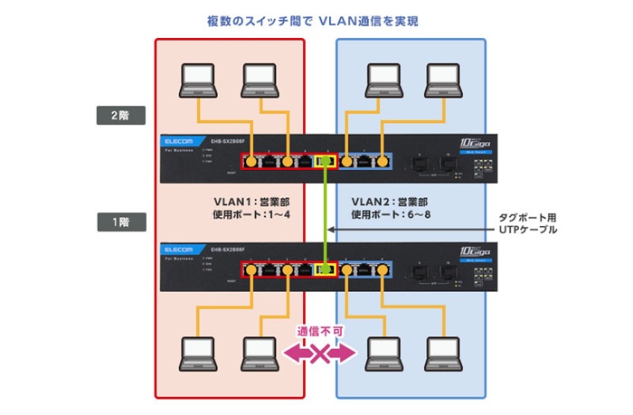 VLAN機能の利用により、社内環境に応じた柔軟なネットワークの共有、分割設定が可能。異なる部門や、フロア間におけるセキュアなネットワーク環境構築を実現します。