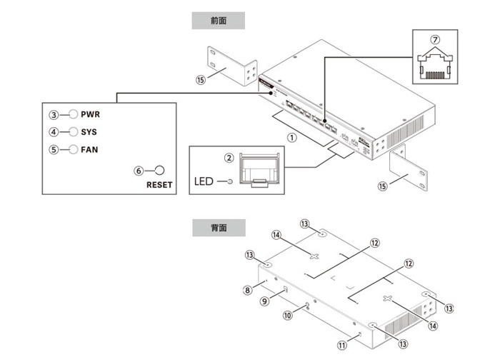 | ① LAN ポート ② SFPポート / LED ※1 ③ PWR LED ④ SYS LED ⑤ FAN LED ⑥ RESET ⑦ LINK / ACT LED ⑧ 電源ケーブル抜け防止バンド取付穴 ⑨ 電源コネクター ⑩ FG端子 ⑪ 盗難防止機構 ⑫ マグネット取り付け部 ※2 ⑬ ゴム足取付部 ⑭ 壁掛け穴 ⑮ 19インチラック取付金具 ※3 |