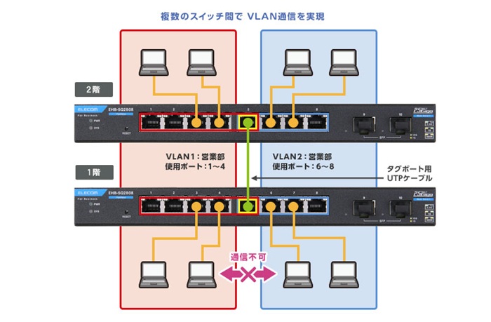 VLAN機能の利用により、社内環境に応じた柔軟なネットワークの共有、分割設定が可能。異なる部門や、フロア間におけるセキュアなネットワーク環境構築を実現します。