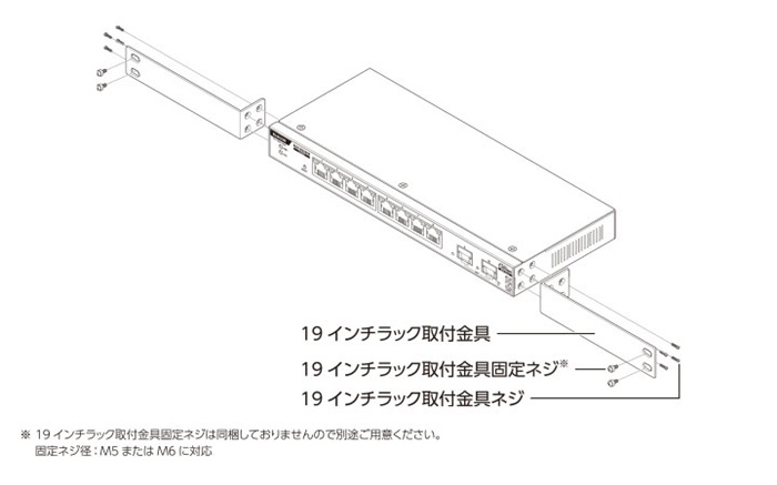 ※3 19インチラックに固定するネジは付属していません。別途ご用意ください。 推奨ネジ:M5またはM6ケージナット