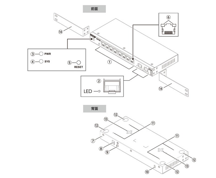 | ① LAN ポート ② SFPポート / LED ※1 ③ PWR LED ④ SYS LED ⑤ RESET ⑥ LINK / ACT LED ⑦ 電源ケーブル抜け防止バンド取付穴 ⑧ 電源コネクター ⑨ FG端子 ⑩ 盗難防止機構 ⑪ マグネット取り付け部 ※2 ⑫ ゴム足取付分 ⑬ 壁掛け穴 ⑭ 19インチラック取付金具 ※3 |