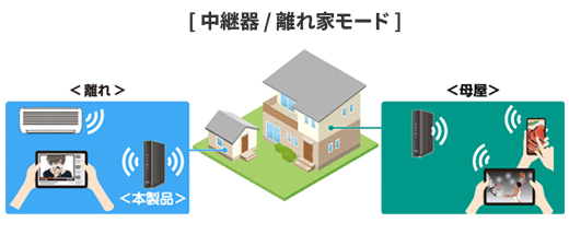屋外を含む敷地内の母屋と離れた建物で中継器として使用可能なほか、「離れ家モード2」対応製品ではすべての基本動作モードに対応。 親機として使用している場合も玄関先やベランダなど敷地内の屋外に設置されたデバイスと5GHz(W56のみ)でWi-Fiで接続することが可能です。
