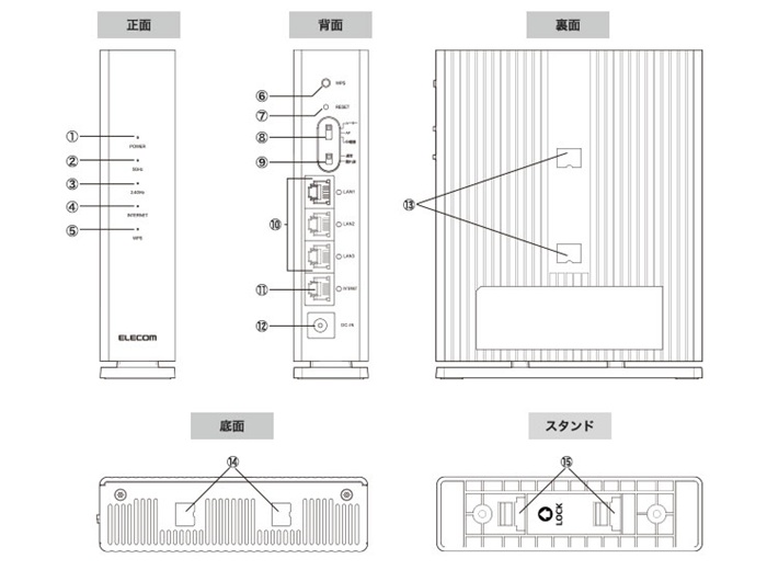 | ① POWER ランプ ② 5GHz ランプ ③ 2.4GHz ランプ ④ INTERNETランプ ⑤ WPSランプ ⑥ WPS ボタン ⑦ RESET ボタン ⑧ 動作モード切替スイッチ ⑨ 離れ家モード切替スイッチ ⑩ LAN ポート / LAN ランプ 1〜3 ⑪ INTERNET ポート ⑫ DC IN (電源ジャック) ⑬ スタンド装着部 (裏面) ⑭ スタンド装着部 (底面) ⑮ スタンド |