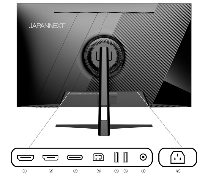 | ①HDMI:2.0 (3840x2160) @60Hz ②DisplayPort:1.4 (3840x2160) @60Hz ③USB-C:3840x2160 @60Hz 65W給電 ④USB-B:KVM ⑤USB-A 1:2.0 KVM (5V/0.5A) ⑥USB-A 2:2.0 KVM (5V/0.5A) ⑦オーディオ出力 ⑧電源ポート |