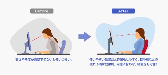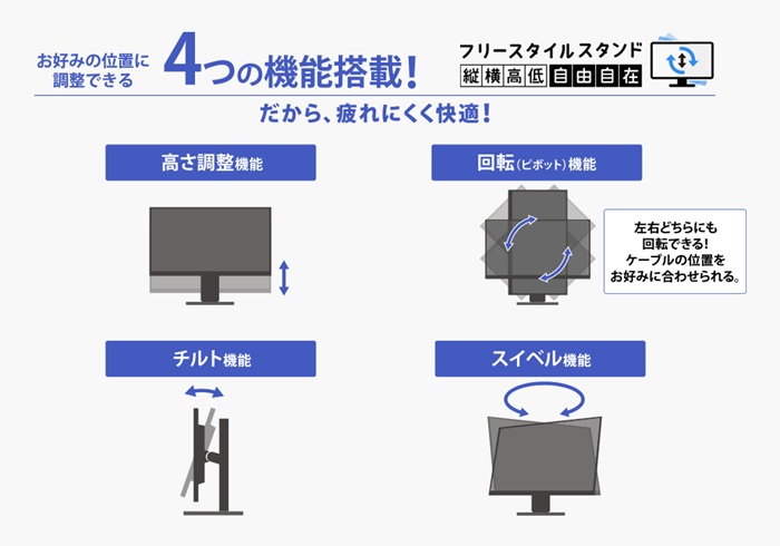 本商品は「フリースタイルスタンド」を採用!見やすい位置に高さや角度を調整することで、目や肩の疲れやストレートネック対策の一つとしても効果的です。