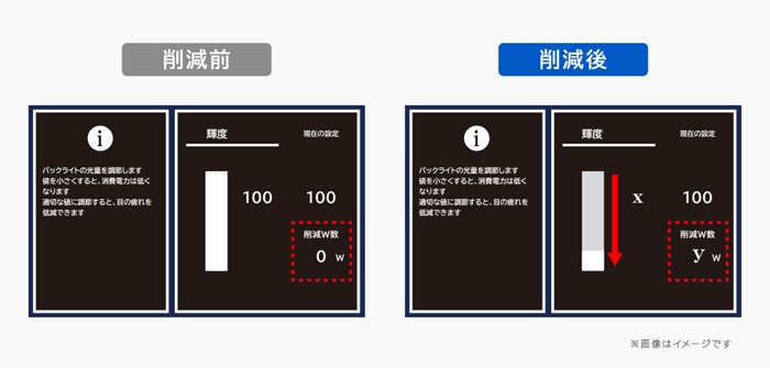 例えば輝度をxまで下げるとyW電力削減して使用することができます。