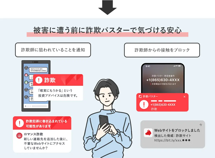 詐欺バスターは詐欺電話、ネット詐欺対策に特化した詐欺対策専用アプリです。