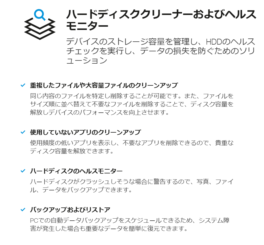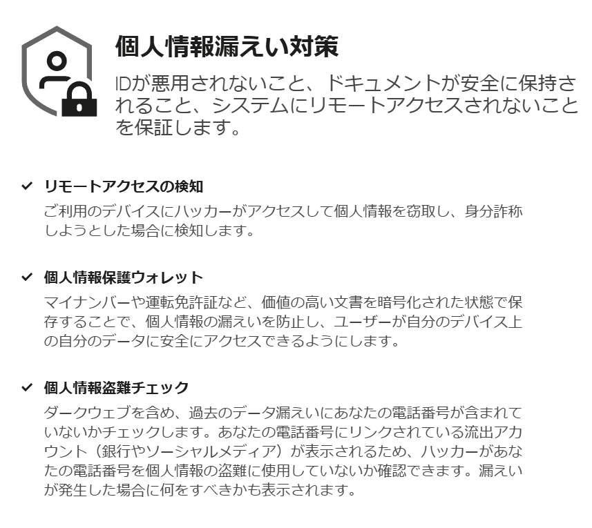 - カスペルスキー スタンダードには、セキュリティ、パフォーマンス、基本的なプライバシーの保護機能が搭載されています。