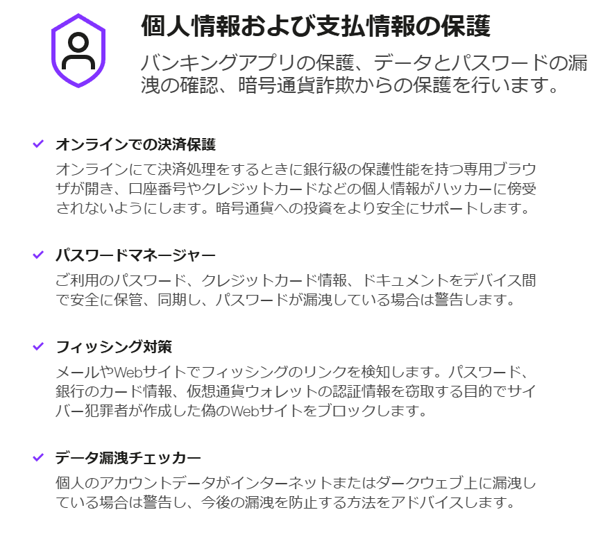 バンキングアプリの保護、データとパスワードの漏洩の確認、暗号通貨詐欺からの保護を行います。