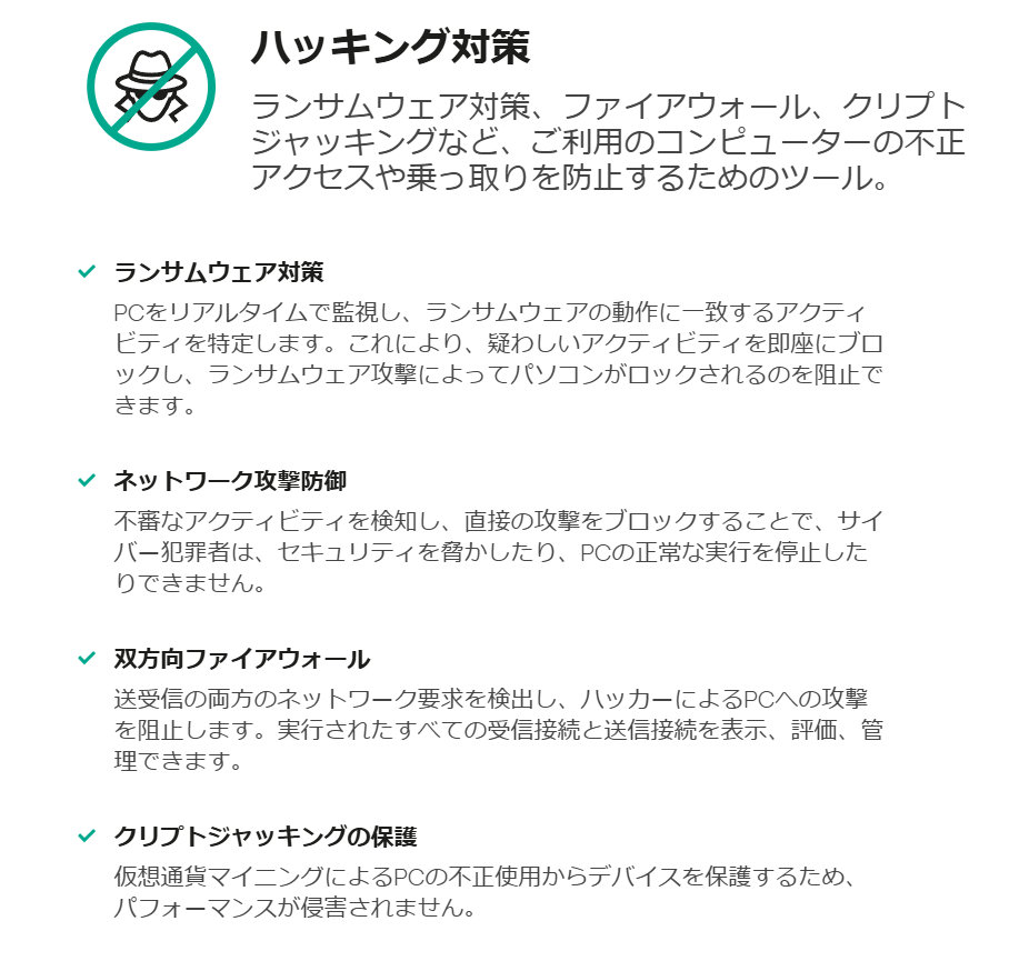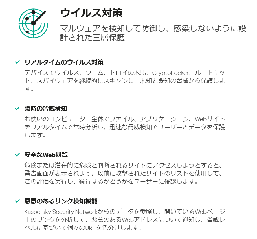 - カスペルスキー スタンダードには、セキュリティ、パフォーマンス、基本的なプライバシーの保護機能が搭載されています。
