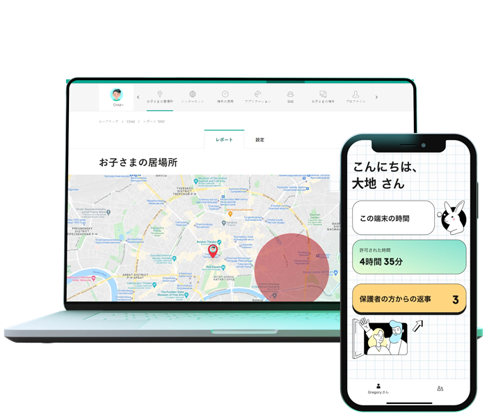お子様の位置を地図上で確認し、保護者が設定した「安全エリア」をお子様が出た場合にアラートを受け取ることができます。
