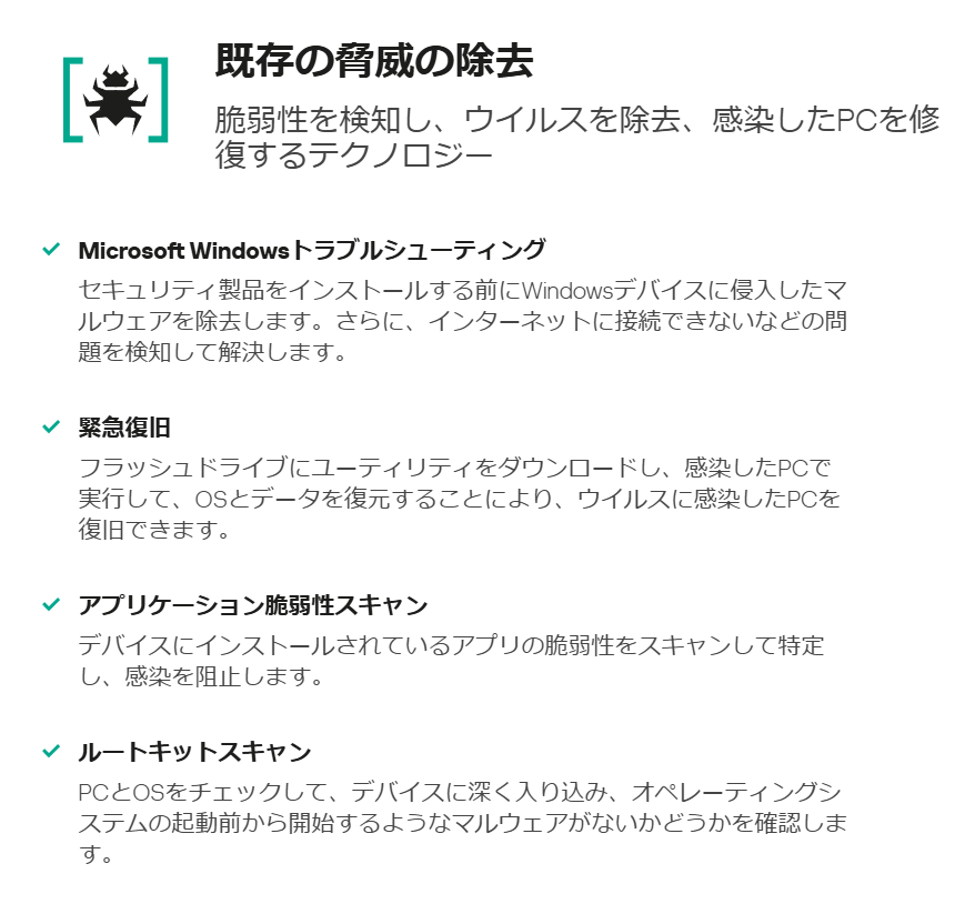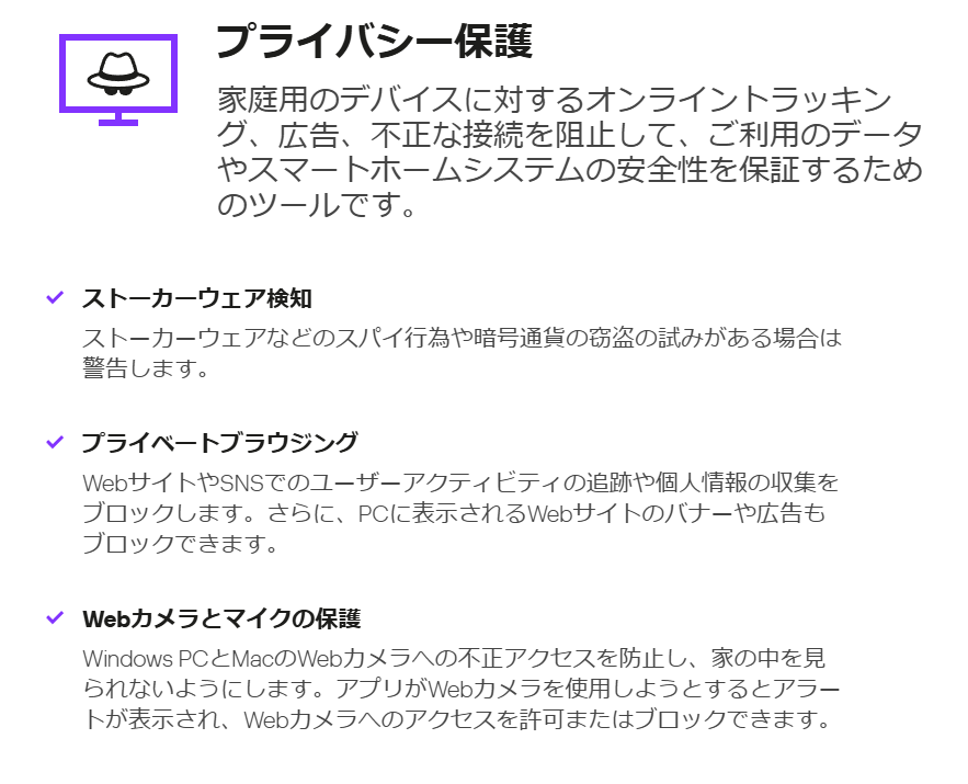 - カスペルスキー スタンダードには、セキュリティ、パフォーマンス、基本的なプライバシーの保護機能が搭載されています。