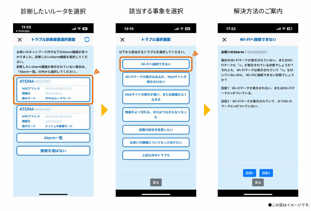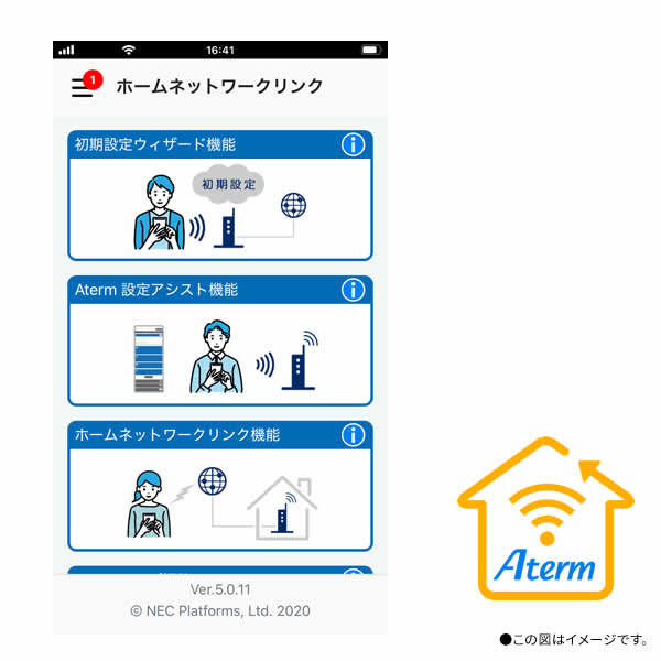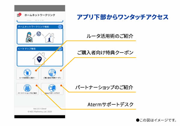 本アプリ内の画面下部に、Atermのサポートデスクや公式サイト、お得な情報などへワンタッチでアクセスできるボタンを配置。また、Atermのアップデート情報や新製品情報などをポップアップ通知でご案内します。設定操作に困ったとき、製品の買い替え時などにぜひご活用ください。
