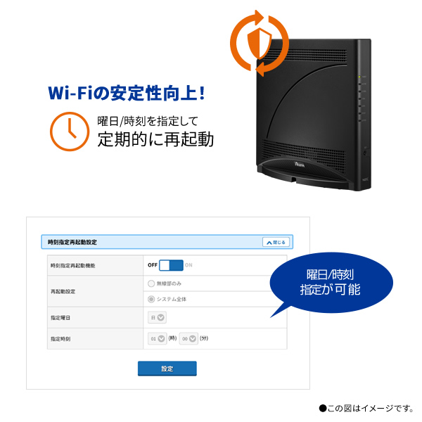 本商品では【クイック設定Web】であらかじめ設定しておくことで、Wi-Fiの再起動を自動化できます。再起動を行う曜日や時刻の指定、無線部のみ、あるいはシステム全体の再起動などご都合に合わせて設定が可能。定期的に再起動をすることで、Wi-Fiの安定性向上やセキュリティリスクを軽減できます。
