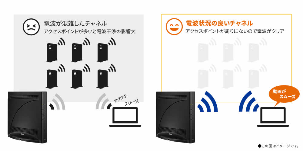 レーダー波を検出しても、それまでと同じチャネルのまま通信を続けます。通信できる帯域幅は少し狭くなりますが、ネット接続が切れる時間を最小限にできるため、安定した通信ができます。