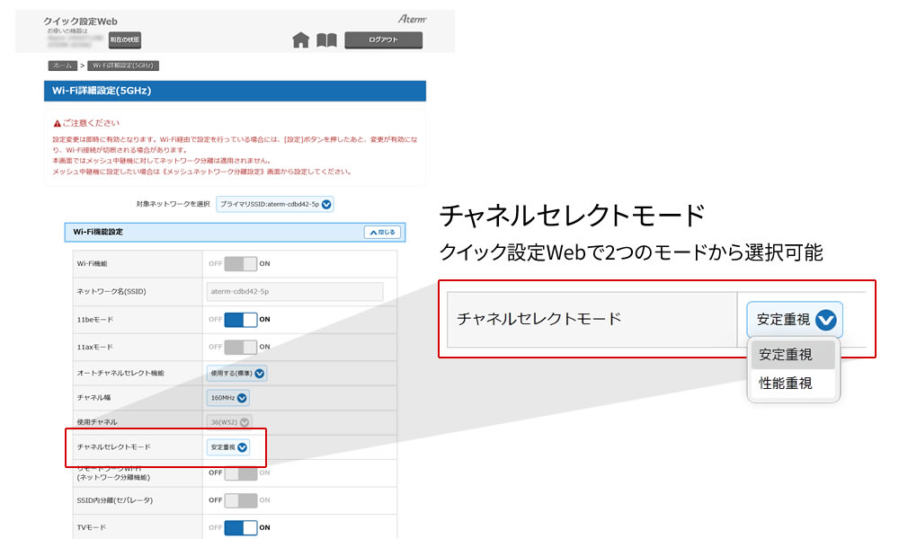 Aterm 19000T12BEでは、このレーダー波検出時の挙動を「クイック設定Web」で2つのモードから選択できます。