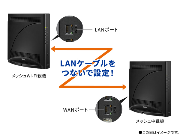 - ※メッシュWi-Fi親機のLANポートとメッシュ中継機のWANポートを、LANケーブルでつなぎます。設定方法はユーザーズマニュアルを参照してください。