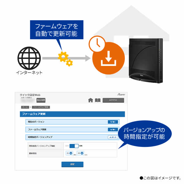 【クイック設定Web】であらかじめ時刻指定しておくことで、ファームウェアの更新があった時には自動でバージョンアップを実施する【自動バージョンアップ機能(時刻指定)】を搭載しました。ファームウェアの確認/ダウンロード/設定といった作業を行う手間が要らない上に、常に最新のファームウェア状態で利用できるので安心です。